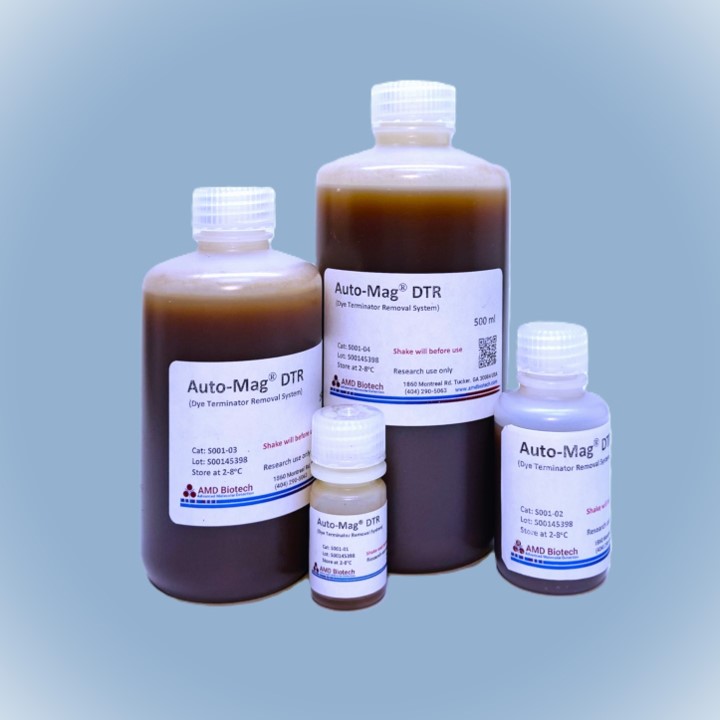 Auto-Mag® DTR (磁珠法测序产物纯化试剂)是基于超顺磁纳米磁珠和特殊缓冲液优化配置而成。能够特异性结合Sanger测序反应中的所有片段。通过三个简单步骤:结合,洗涤和洗脱,从Sanger测序反应混合物中去除多余的引物二聚体,盐和未结合的染料终止剂,快速完成测序产物的纯化。纯化后的产物可直接进行3730XL等遗传分析仪进行测序。Auto-Mag® 磁珠法测序产物纯化试剂具有的高灵敏度和结合能力,可降低BigDye®化学试剂的使用浓度,信号强且均匀,背景噪音极低,实现更长的连续读取长度。 与基于Sephadex 的纯化试剂相比,Auto-Mag® 测序产物纯化试剂操作过程操作简单快速,无需离心,不仅适合手工操作处理样品,而且可适用于当前市场上的自动化平台进行高通量纯化。