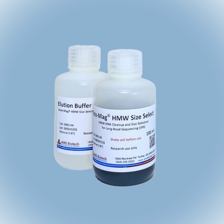 磁珠法高分子量DNA片段分选纯化回收试剂是AMD公司开发制备的新产品。主要是针对高分子量基因组DNA(HMW DNA)的纯化和大小选择。用于快速去除HMW DNA样品中的小片段DNA, 工作适用范围是5kb至100kb或以上。 使用操作和NGS文库DNA片断分选过程类似,只需调整试剂与样本的体积比,即可从高分子量 DNA 样本中快速去除长度 <5kb、<10kb、<20kb 或 <30kb 的 DNA 片段至痕量水平,同时可回收所需的大尺寸 DNA 片段:>5kb、>10kb、>20kb 或 >30kb。满足第三代测序平台对 DNA 样本的要求。适用于如PacBio SMRT Technology 或Oxford Nanopore Technology.的测序平台。是一款全新且真正可实现对高分子量基因组DNA(HMW DNA)的纯化和大小选择的产品。按照该产品常规操作规程,每个检测需要约65-75微升试剂。
